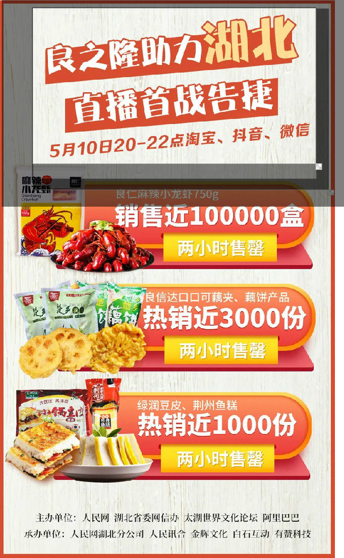 良之隆助力湖北重振,首戰(zhàn)取得開門紅!來自武漢良之隆食材股份有限公司的良仁麻辣小龍蝦銷售近100000盒;良信達口口可藕夾、藕餅產(chǎn)品熱銷近3000份;綠潤豆皮、荊州魚糕熱銷近1000份