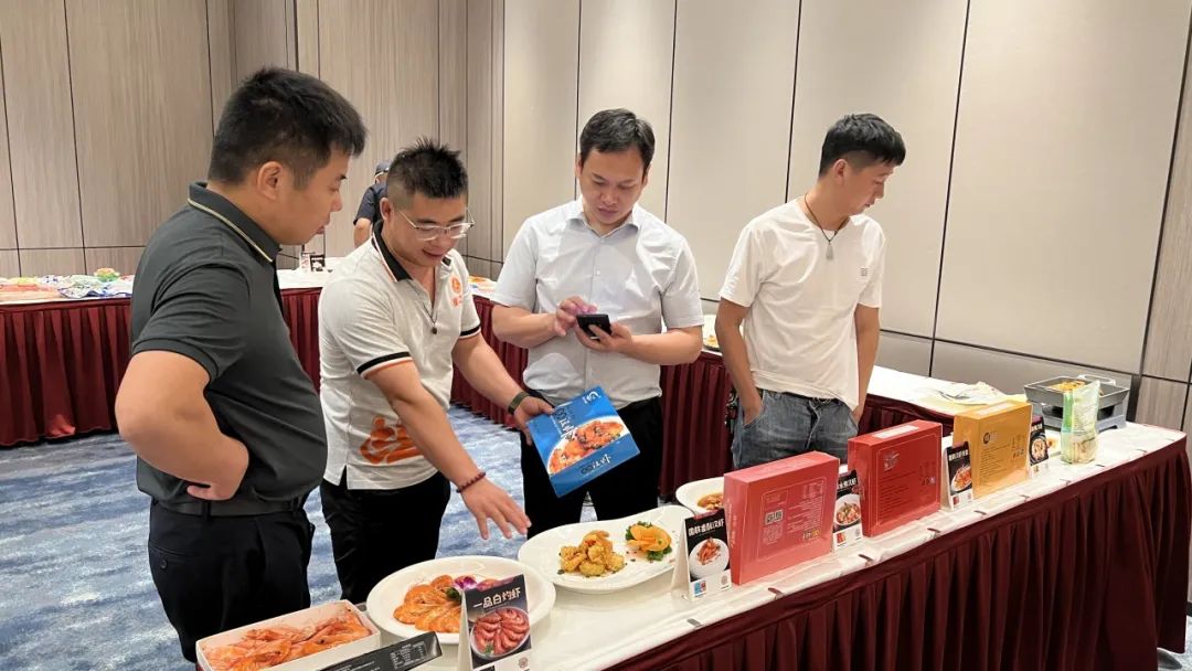 下午2點(diǎn),嘉賓陸續(xù)到場簽到。在工作人員的帶領(lǐng)下參觀大廳陳列的特色產(chǎn)品。以國聯(lián)漢蝦系列、美佳蟹柳及良之隆2024年主推新品組成的近20款菜式琳瑯滿目,香氣四溢,吸引了眾多餐飲客戶的目光,大家紛紛打卡拍照?,F(xiàn)場咨詢不斷,來自工廠及門店的資深負(fù)責(zé)人從養(yǎng)殖、加工到菜式推廣為客戶做一一解答。